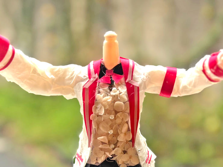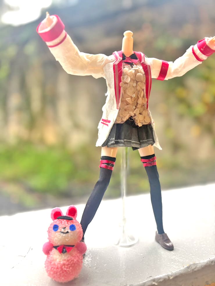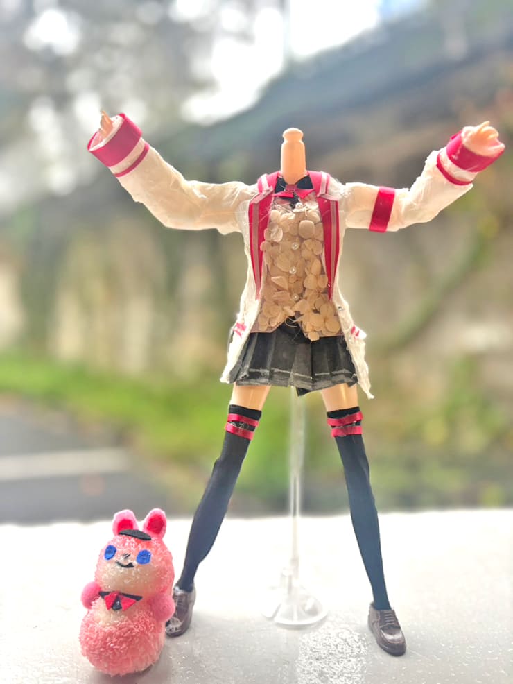 Comment | 制服風の初期衣装再現。 シャツ、ベスト、ジャケットの重なりを丁寧に表現。 ニット感を出すため紫陽花の花びらを使用。 ジャケットの丈感とニーハイソックスとのバランスも再現。にぎにじダンスポージングで。 |