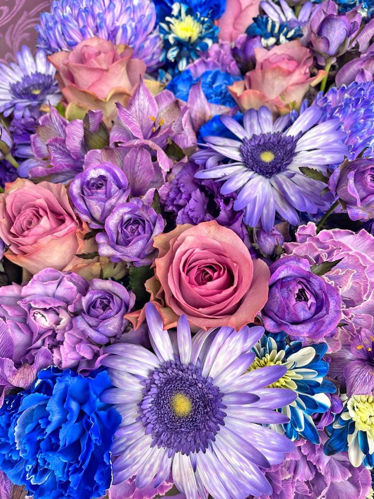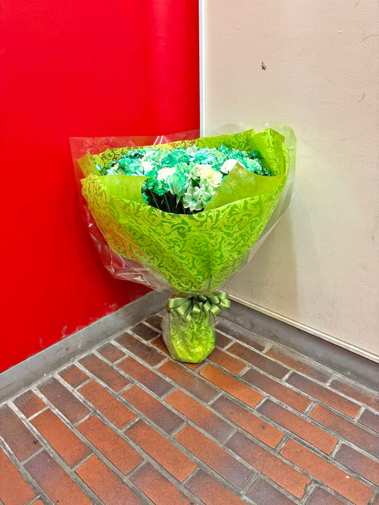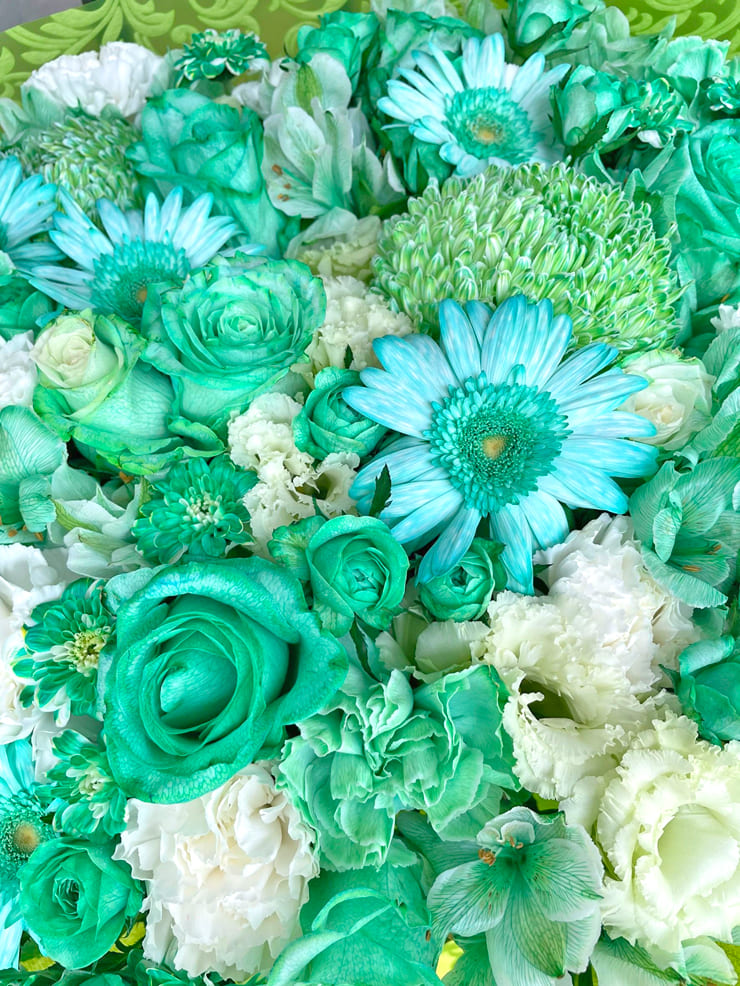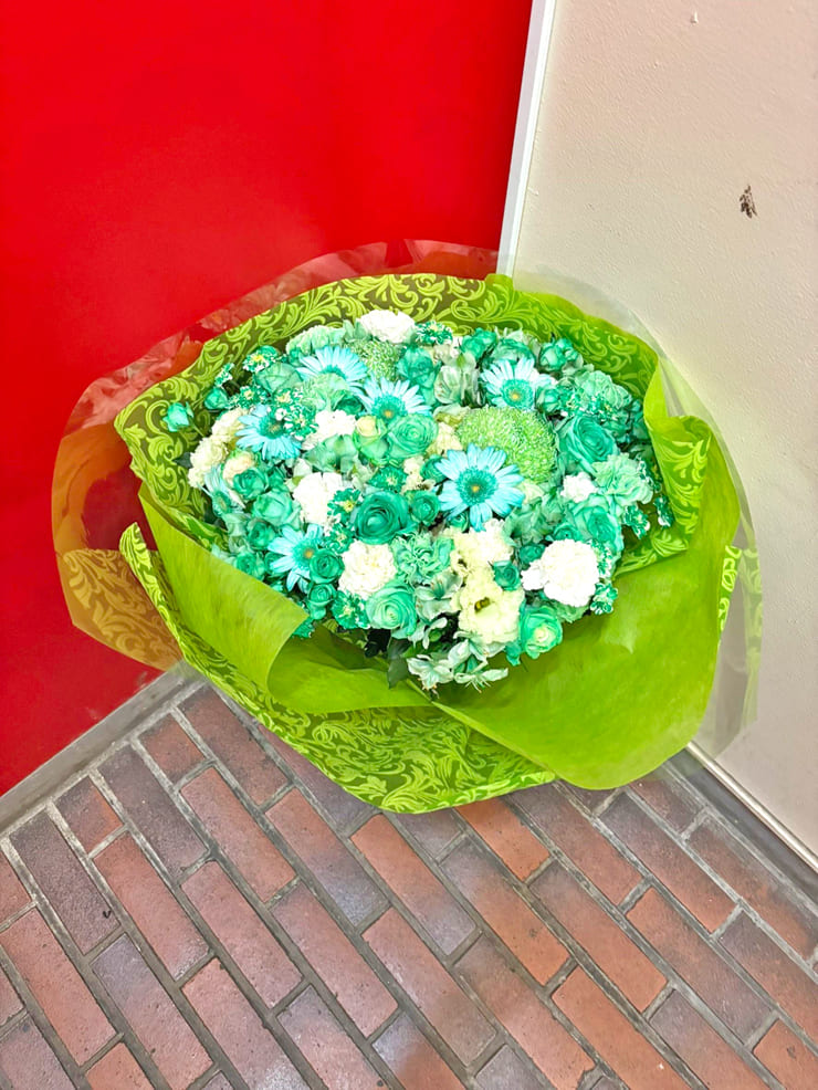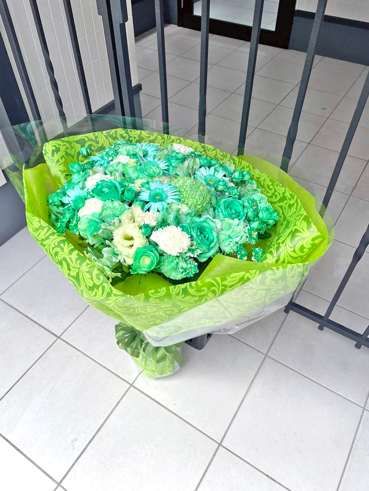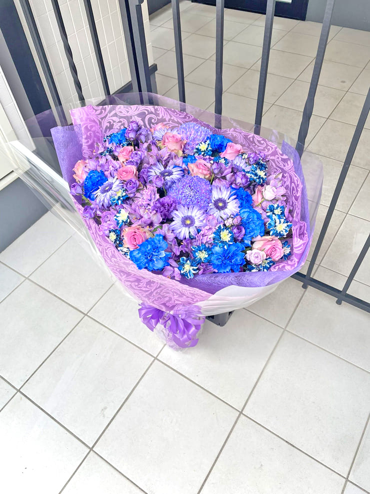 Comment | メンバーカラー『紫』『緑』の花束。 紫にポイントで青を入れて色に変化を付け、緑は染色ポイントで白を入れてお作りしましたお作りしました。 |