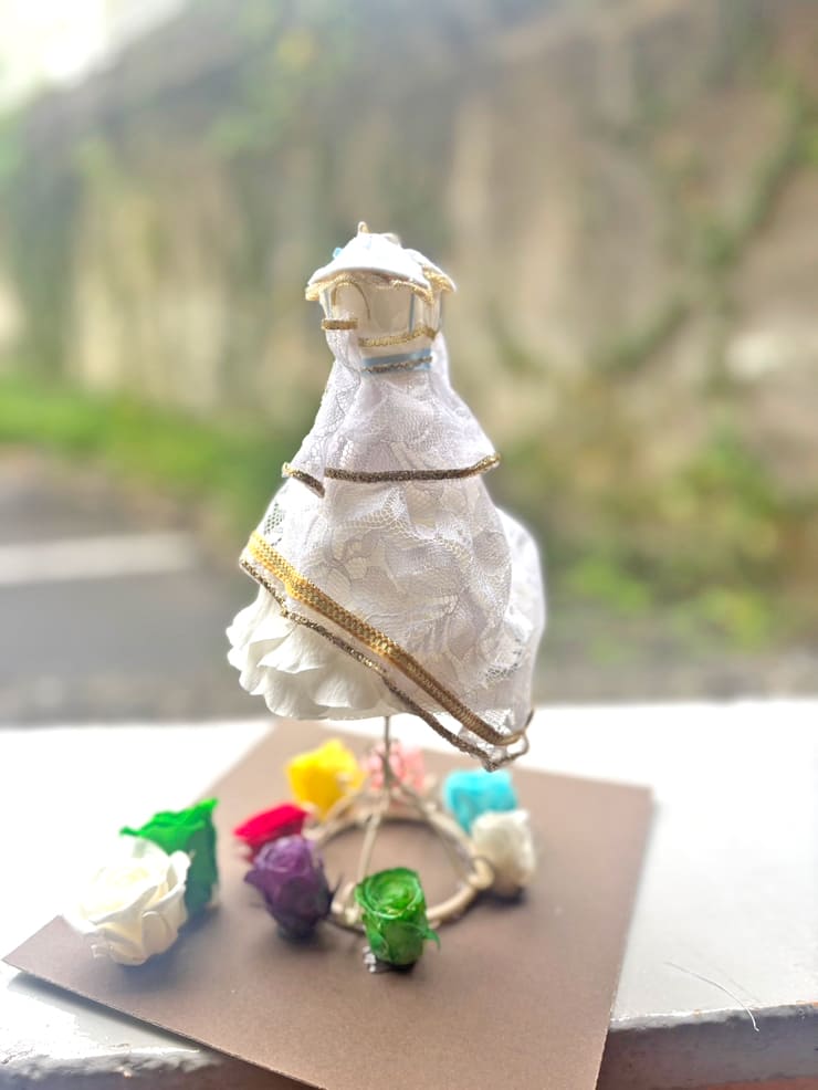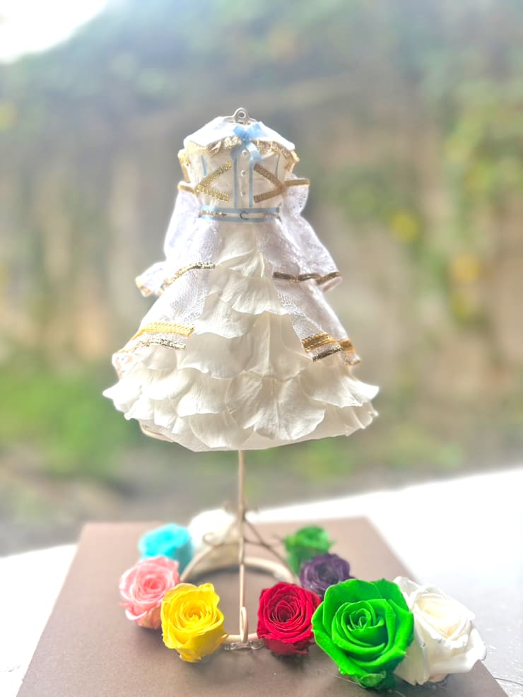 Comment | 白ベースのドレス再現。 シルエットにこだわりたっぷりのバラの花びらをふんわりと構成。 レースも使い再現率を高めて。襟部やリボンなど細部まで丁寧に。 |