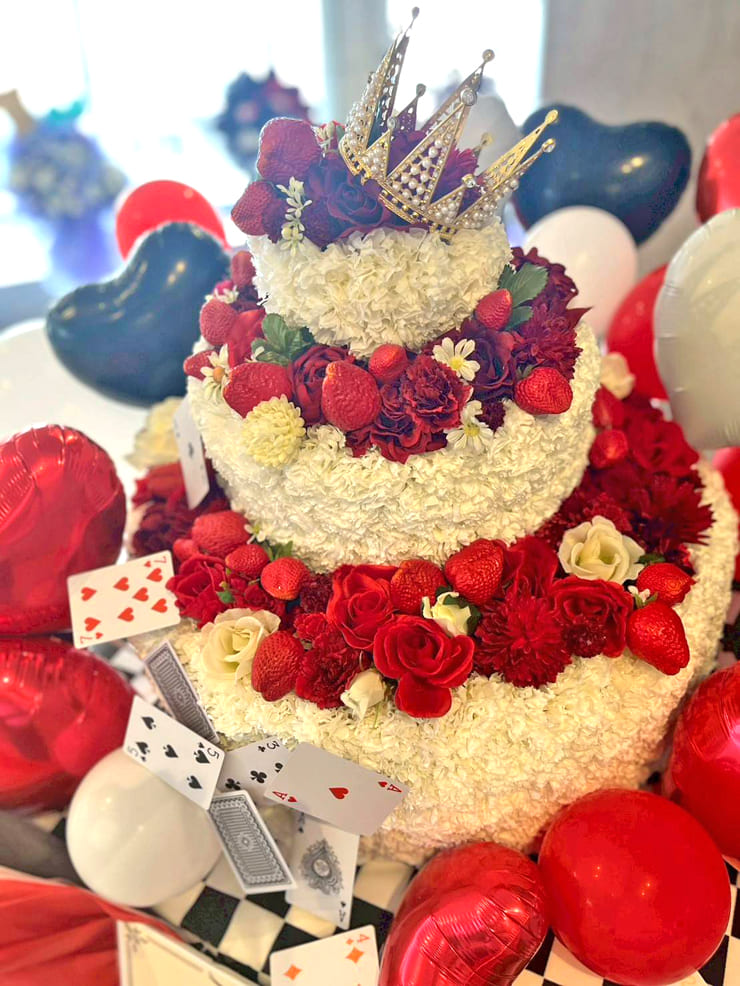 カーネーション、ガーベラ、ダリア、バラ 、イチゴ、不織布、バルーン、トランプ、王冠