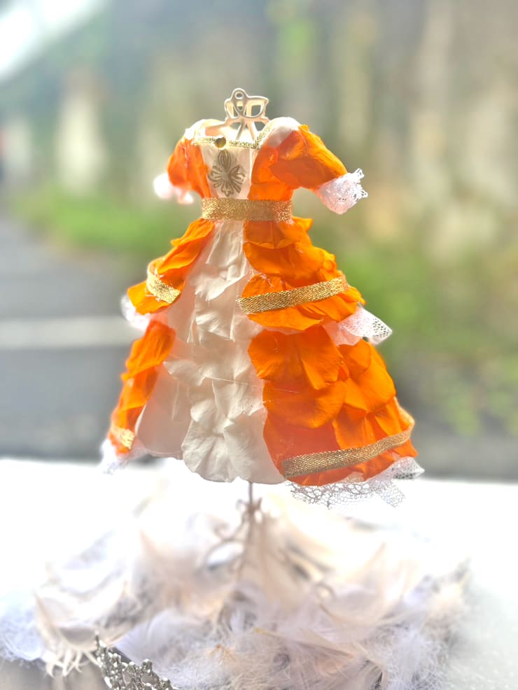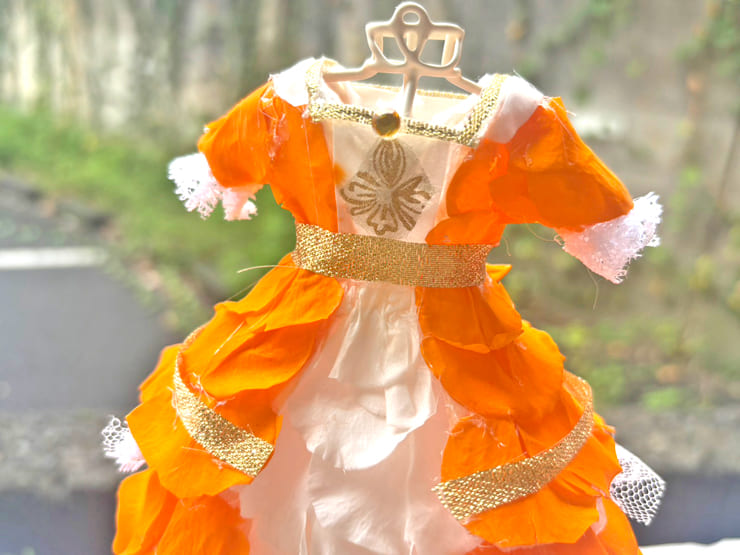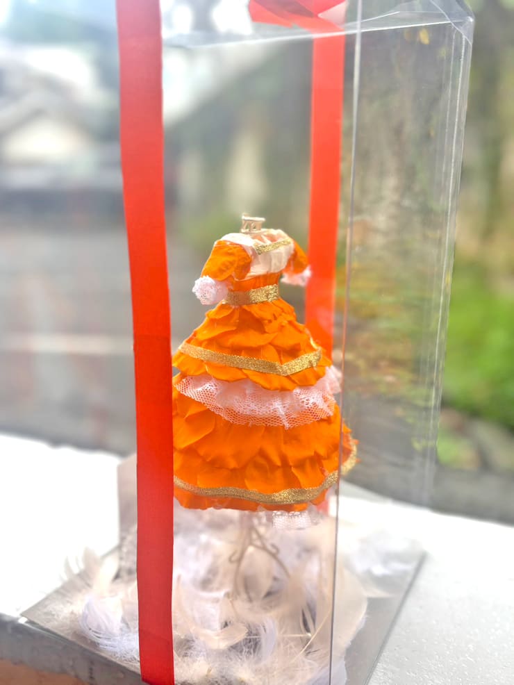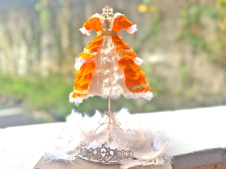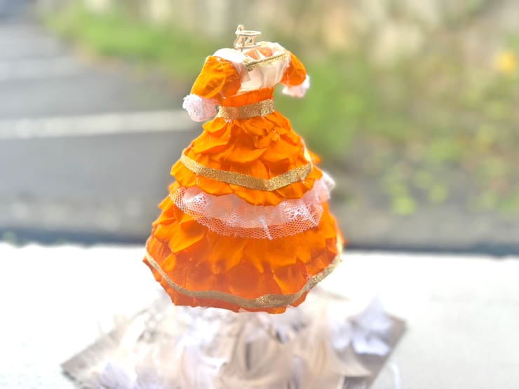 Comment | オレンジミニドレス再現。 スカートの切り替え部分、袖口のレース部分など忠実に再現。胸元の刺繍部分も。 ティアラを足元に設置しフェザーとともに装飾。 |