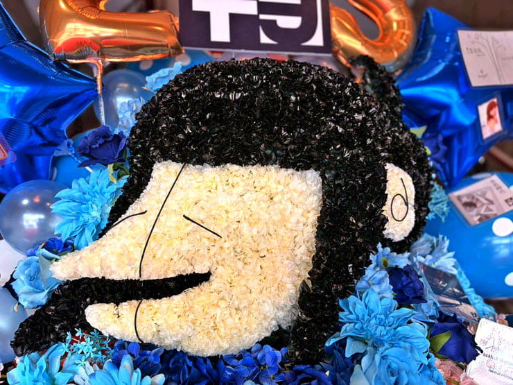 モチーフのお顔を立体的に仕上げました。手作りのパネルをフラスタ全体に散りばめています。