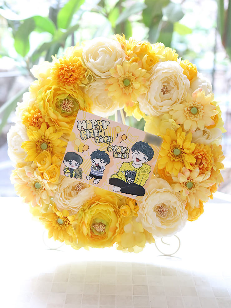 | Comment | 造花のリース。そのまま飾れるようにスタンドに立てています。 黄色の濃淡で優しいイメージ。 お花一輪ずつがキレイに見えるよう少しずつ違う黄色が隣り合うようにしています。 |