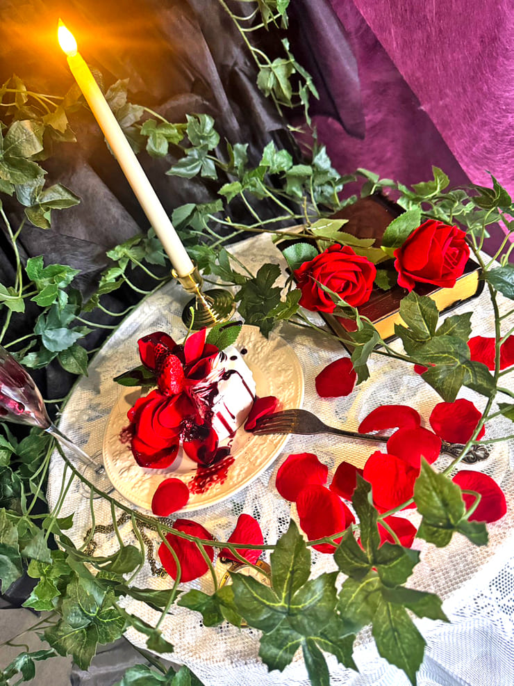 フラスタの前にはテーブルを用意し赤バらの花びらを散らしたり、ワイングラスなどを配置し備品などでテーブルコーディネート。
