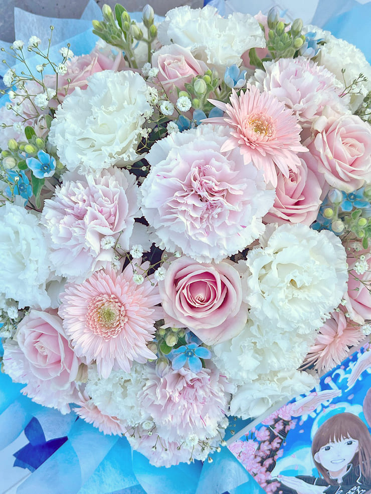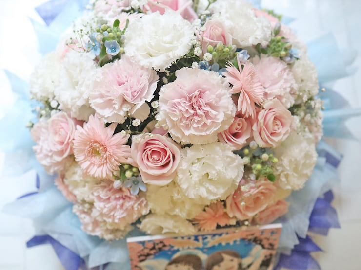 バラ、トルコキキョウ、カーネーション、ガーベラ、ブルースター、かすみ草、不織布、リボン |