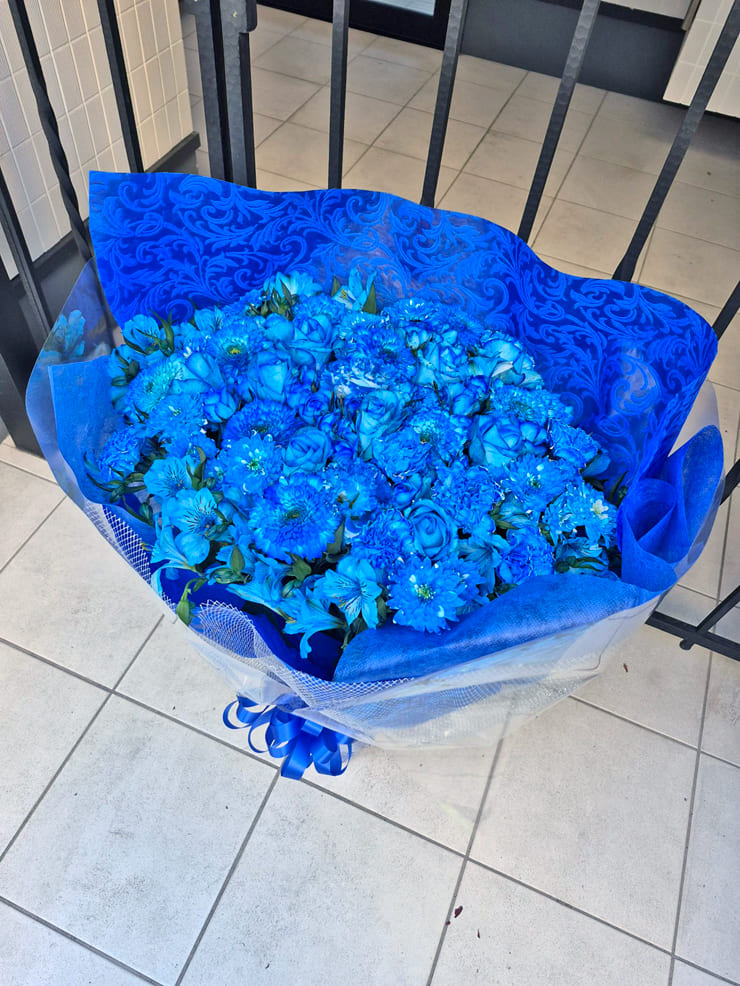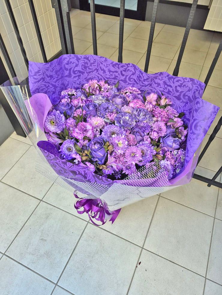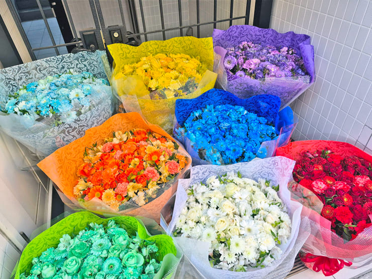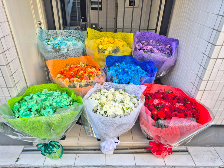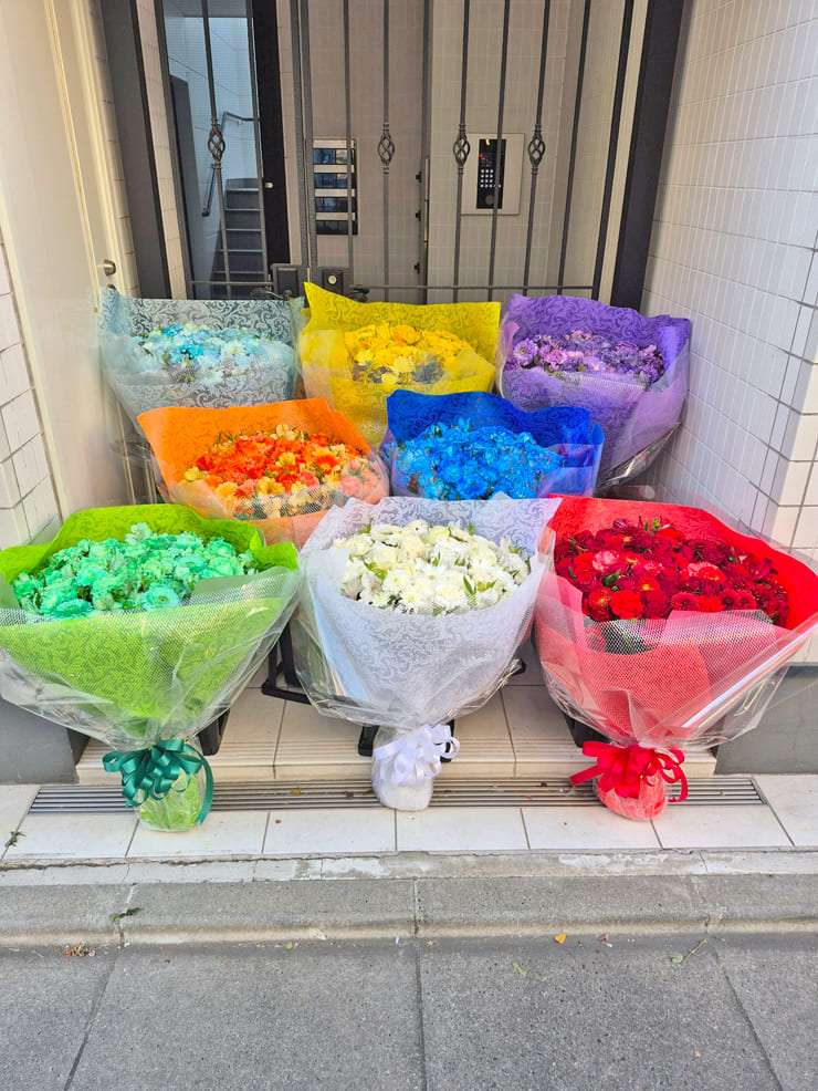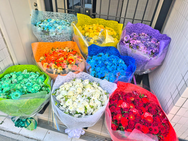 | Comment | メンバーカラーの8色の花束をお作りしました。 ラッピングにシルバーのメッシュをポイントで入れました。 |