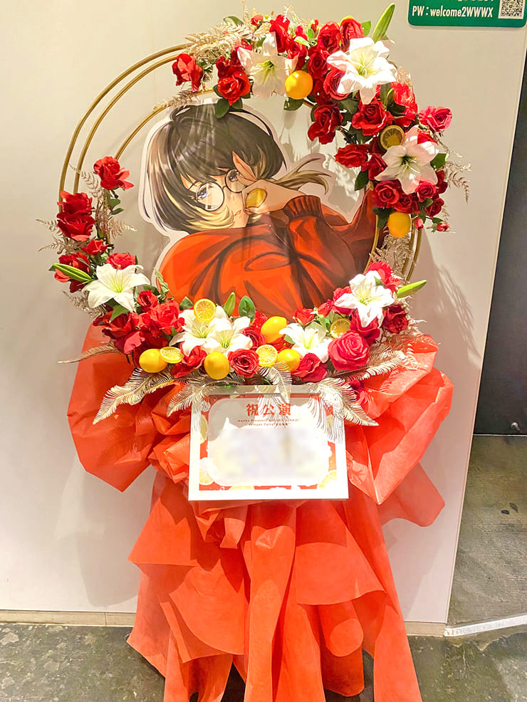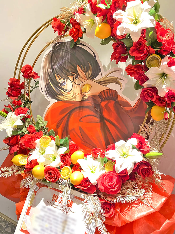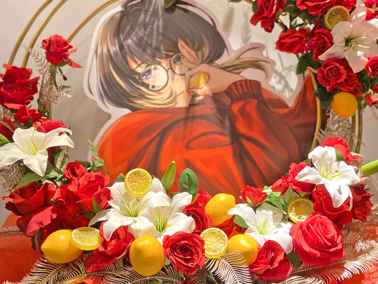 | Comment | イラストパネルを中心にしてまわりを囲むように大きな金の輪をつくり赤バラと白ユリ装飾。 ポイントでレモンをお付けしてイメージに合わせで仕上げました。 |