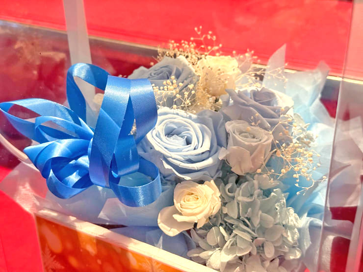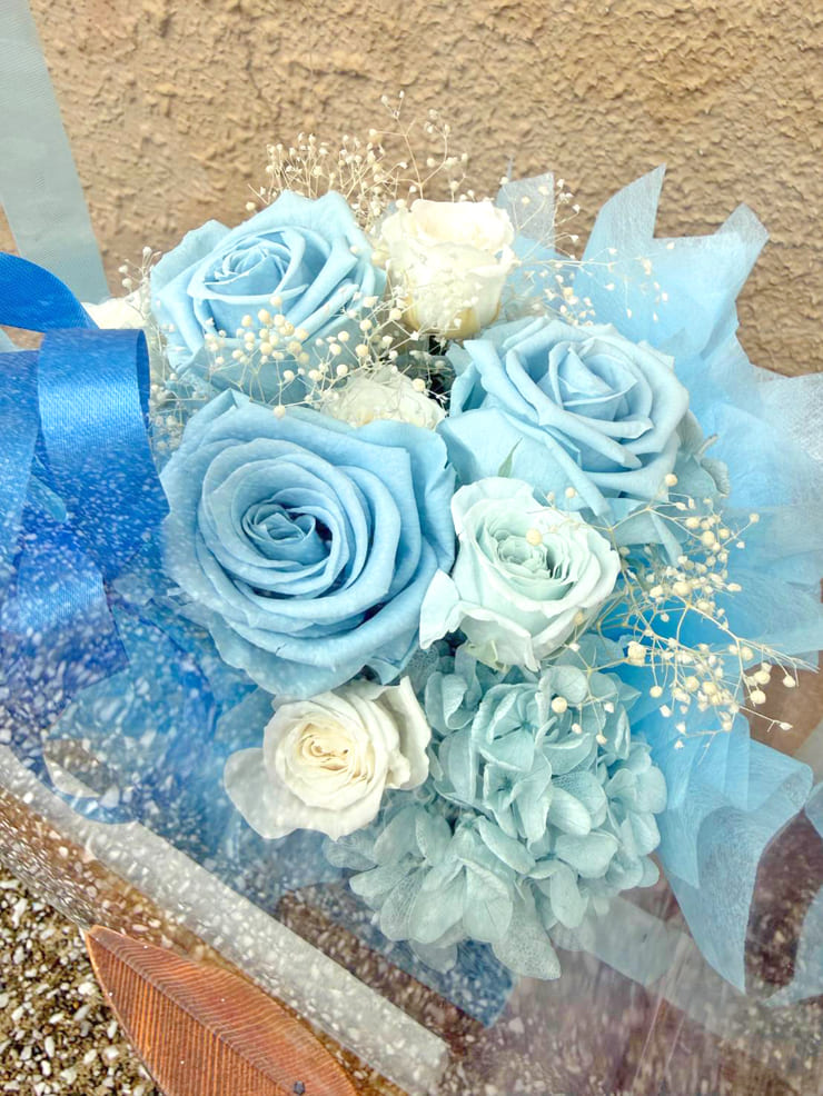 | Comment | お客様のデザインです。 プリザーブドフラワーで制作。空色の、アレンジメント。 水色のお花メインで制作しました。リボンでラッピングしました。 |