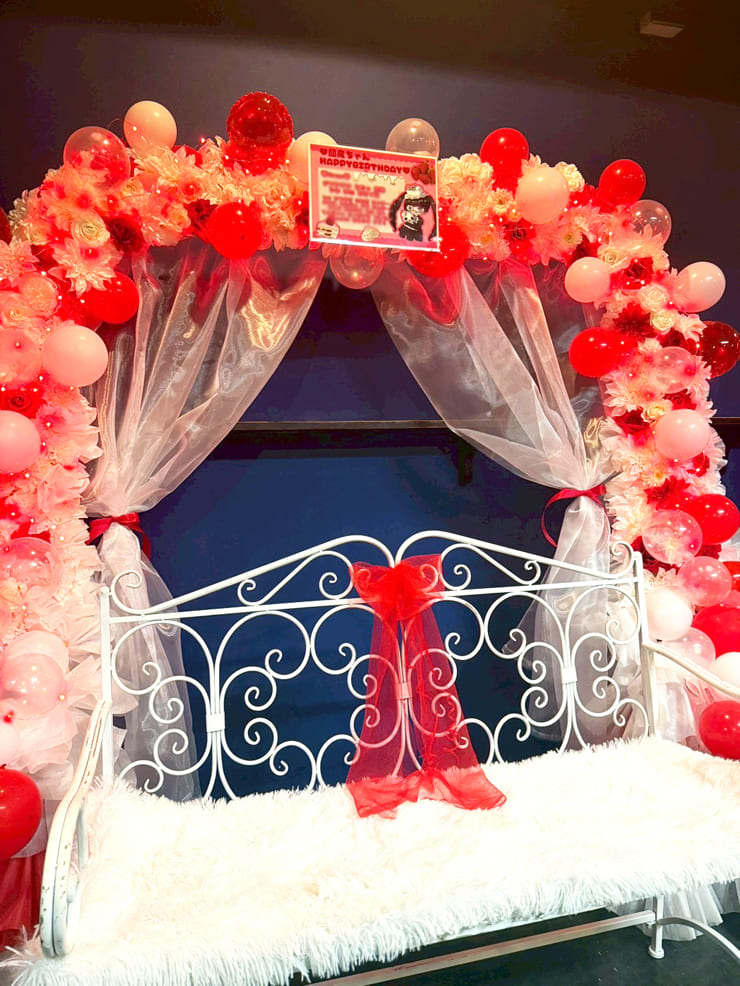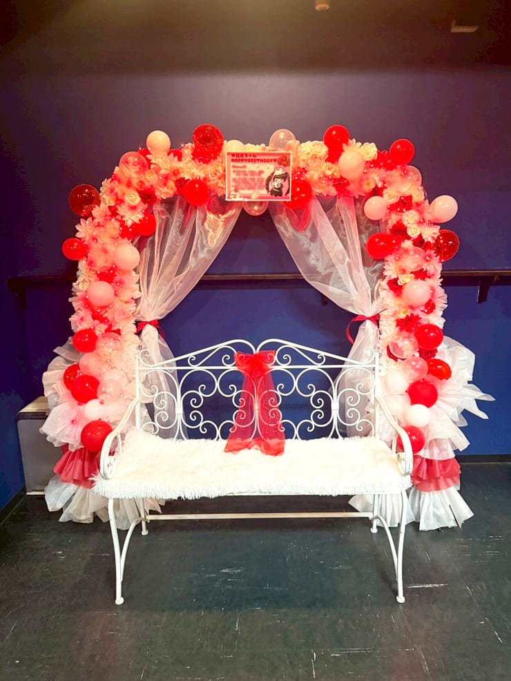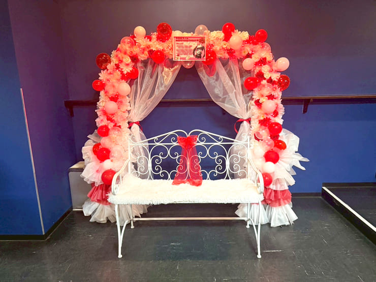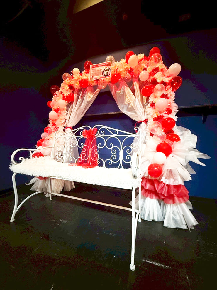 バラ、ダリア、カーネーション、ガーベラ、不織布、オーガンジー、バルーン、ベンチ、絨毯、電飾赤 |