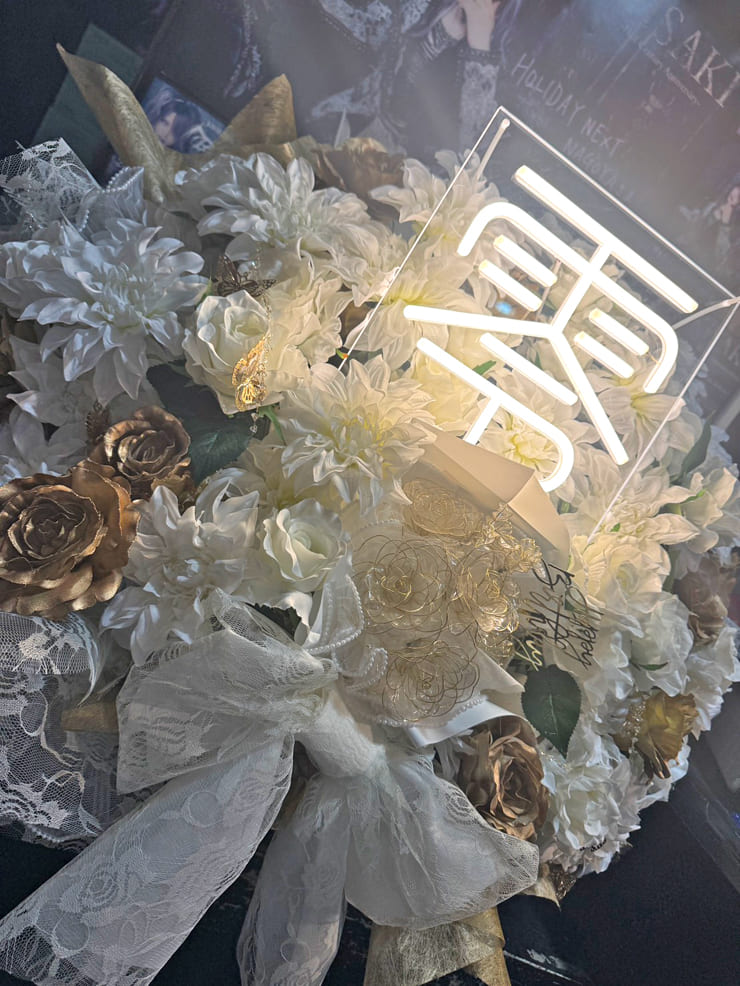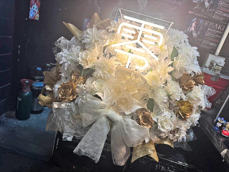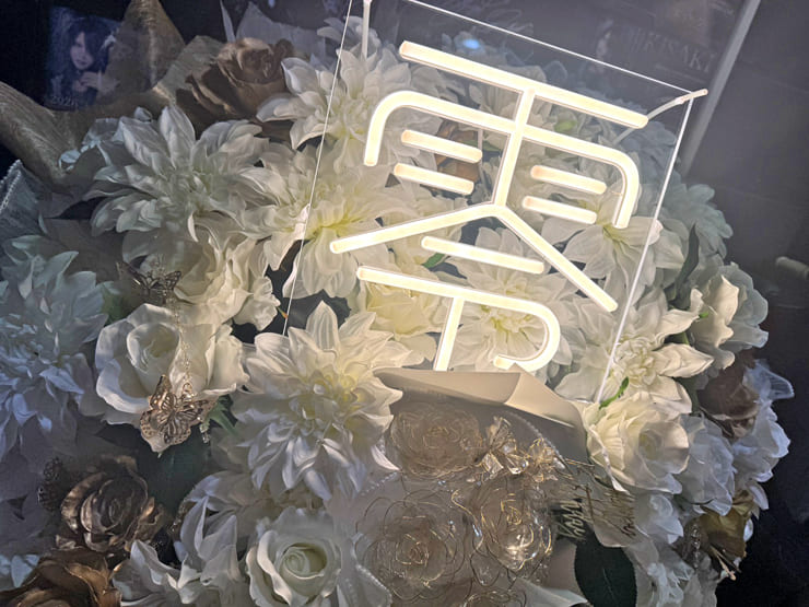 | Comment | 白バラ多め白色メインに、ゴールドバラを周りに入れ中心にディップフラワーの花束を。 周りには不織布、中央にはアクリルパネルにネオンを配置し完成。 |