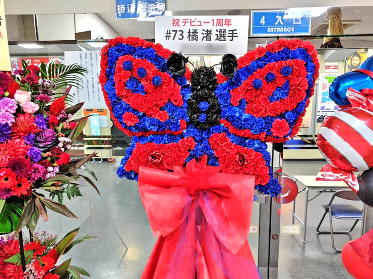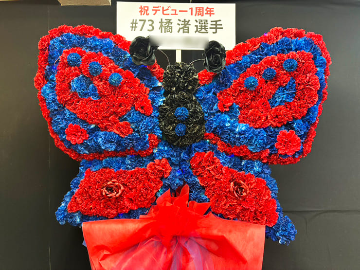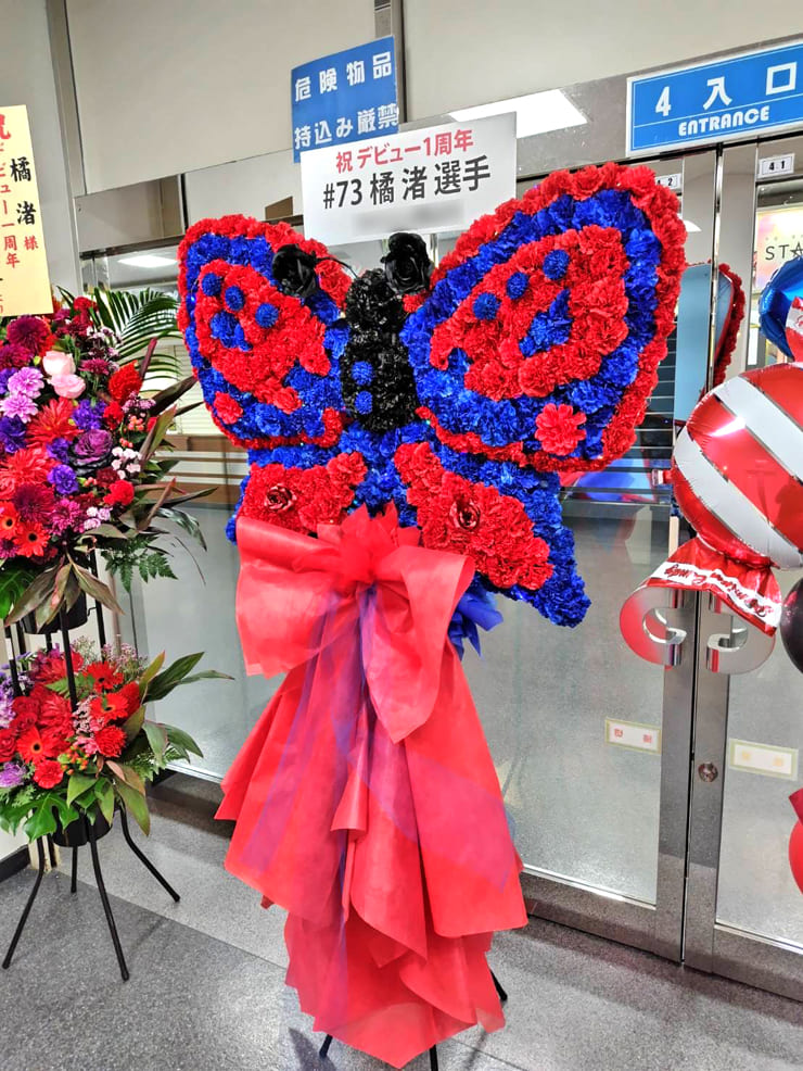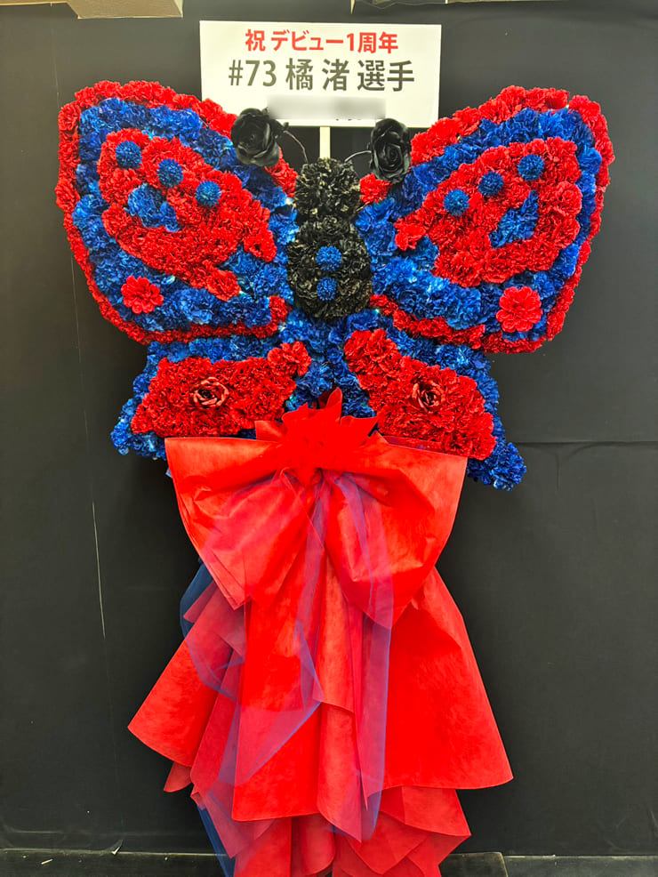 橘渚選手のデビュー1周年祝い蝶々モチーフフラスタ @後楽園ホール