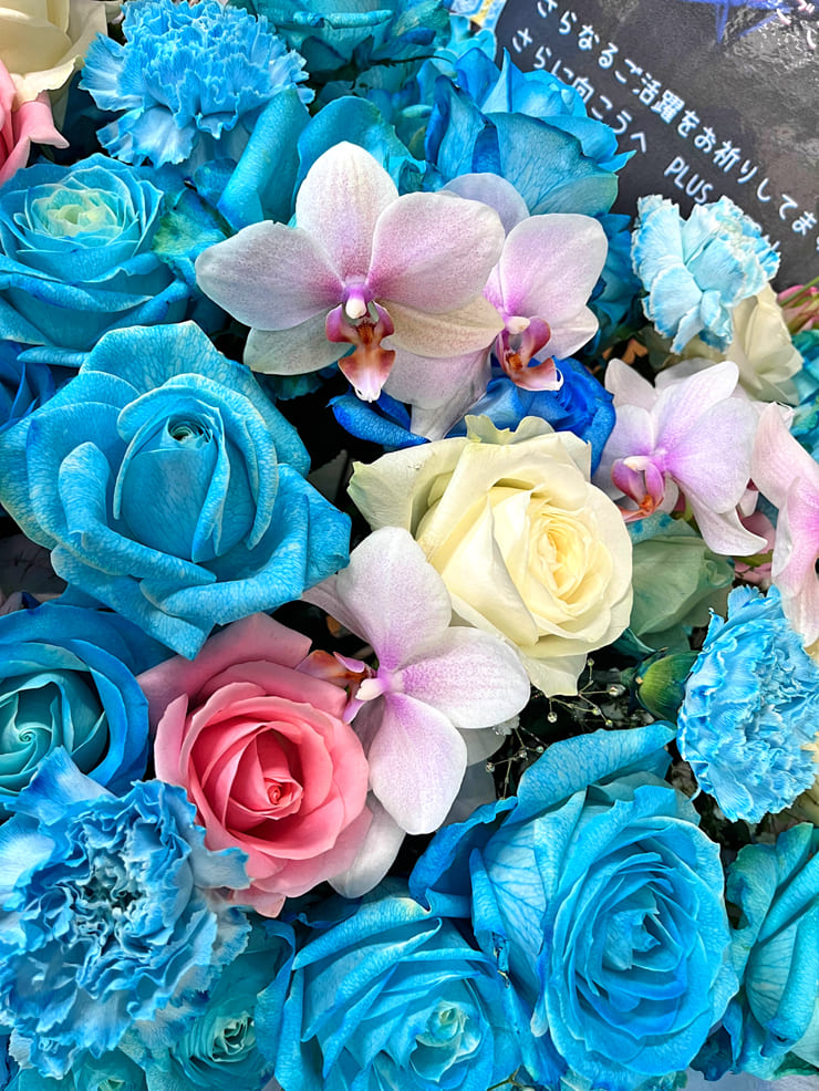| Comment | 水色、ピンク、白の花を基調にのびのびと自由な感じで可愛く仕上げました。 水色のラッピングでお花周りをカバー。 胡蝶蘭のハルガスミで動きのあるアレンジに。 |