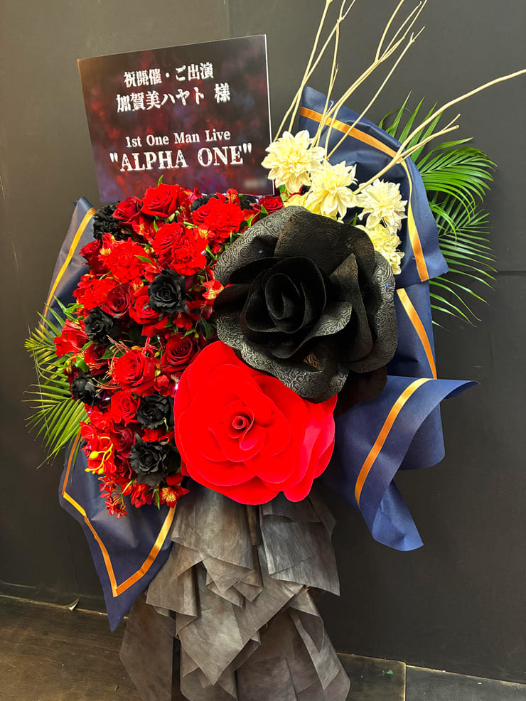 | Comment | 赤×黒のお花で右上がりのアシンメトリーの形でデザインしています。 ラッピング用紙にゴールドのリボンを貼り付けて衣装イメージも追加しています。 赤バラ、黒バラを中心に豪華なイメージでお花も選出いたしました。 LEDライトがキラキラと光ります。 |