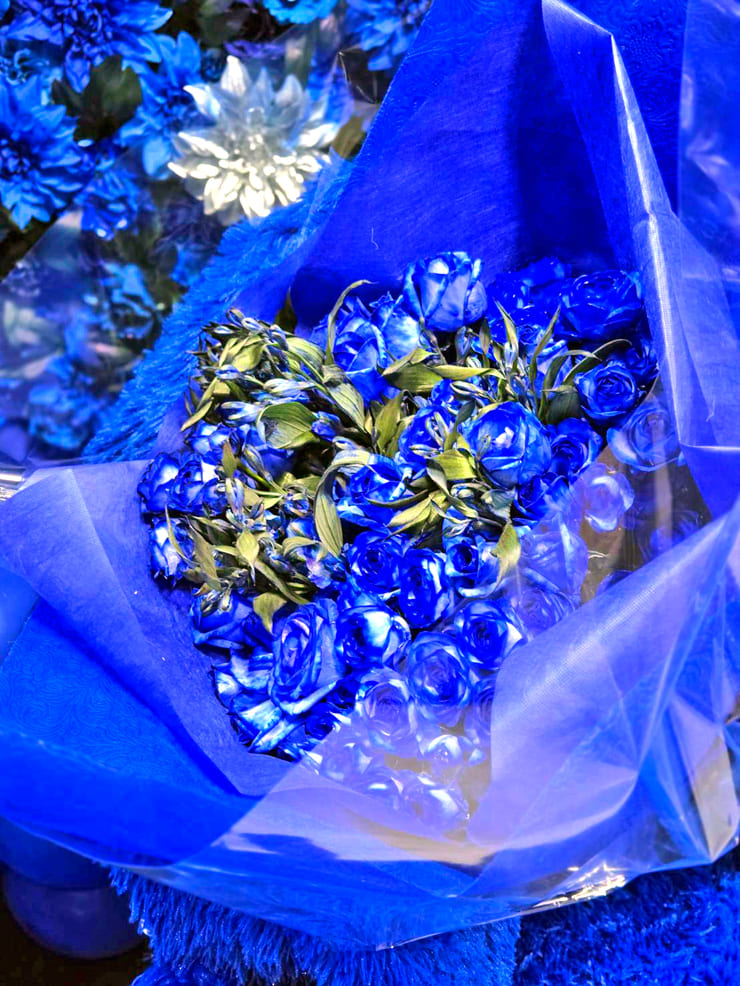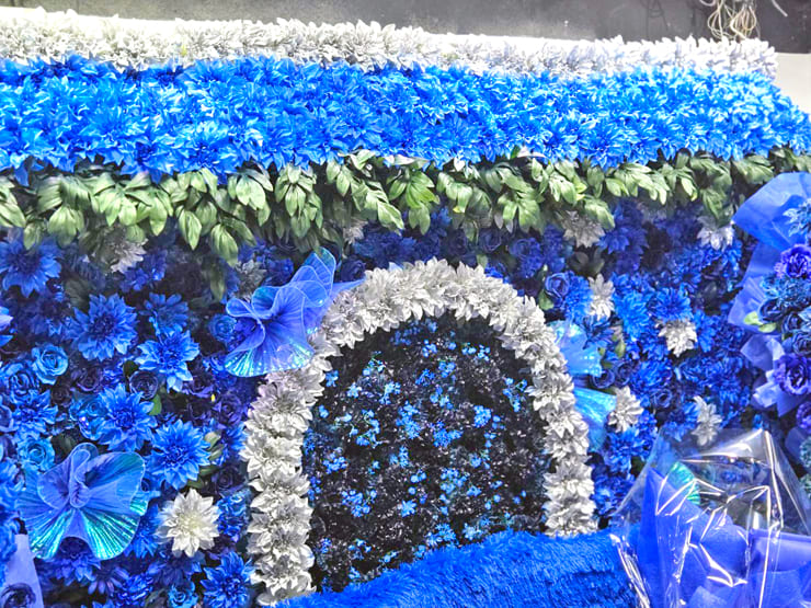 | Comment | 花壁、屋根、2段、3基連結+2基。立体感を出しています。 中央シルバーのお花で、ドアを再現しました。 青一色で、おつくりしました。 大きめ花束、青バラメインでおつくりしました。リボンは、3種を使用しました。 |