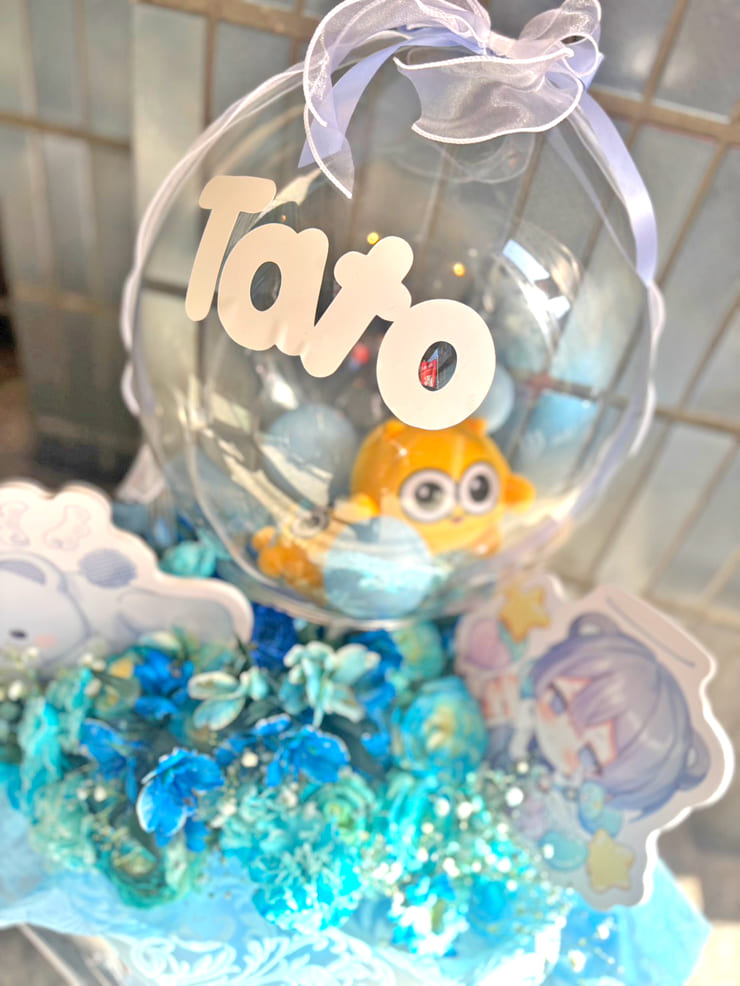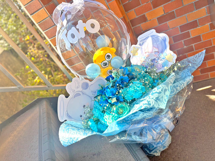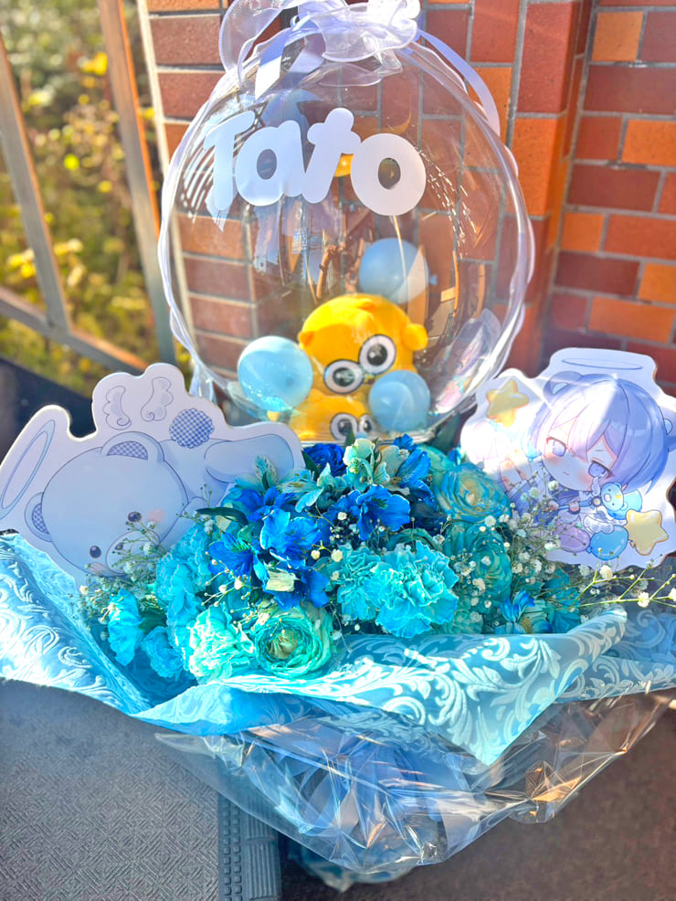| Comment | ぬいぐるみ入りクリアバルーンを組み込んだ花束。 ぬいぐるみとミニバルーンはクリアバルーンの中で動くように敢えて固定せずに。 水色ベースの大きな花束。 パネルも組み込み。同色のリボンとペーパーでラッピングして。 |