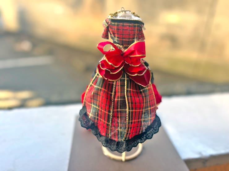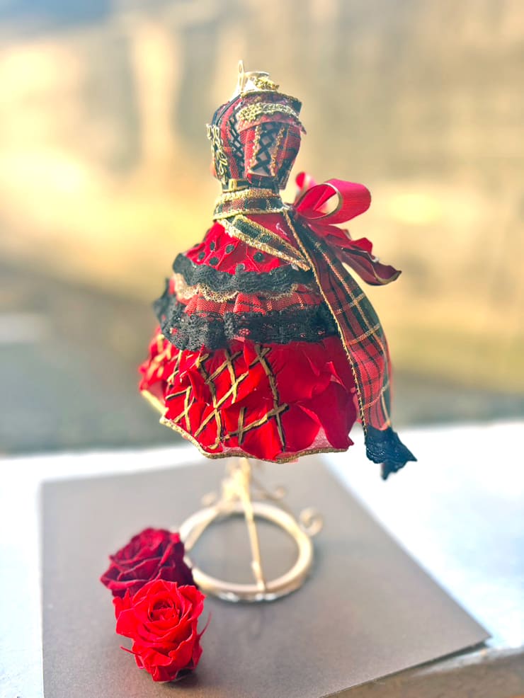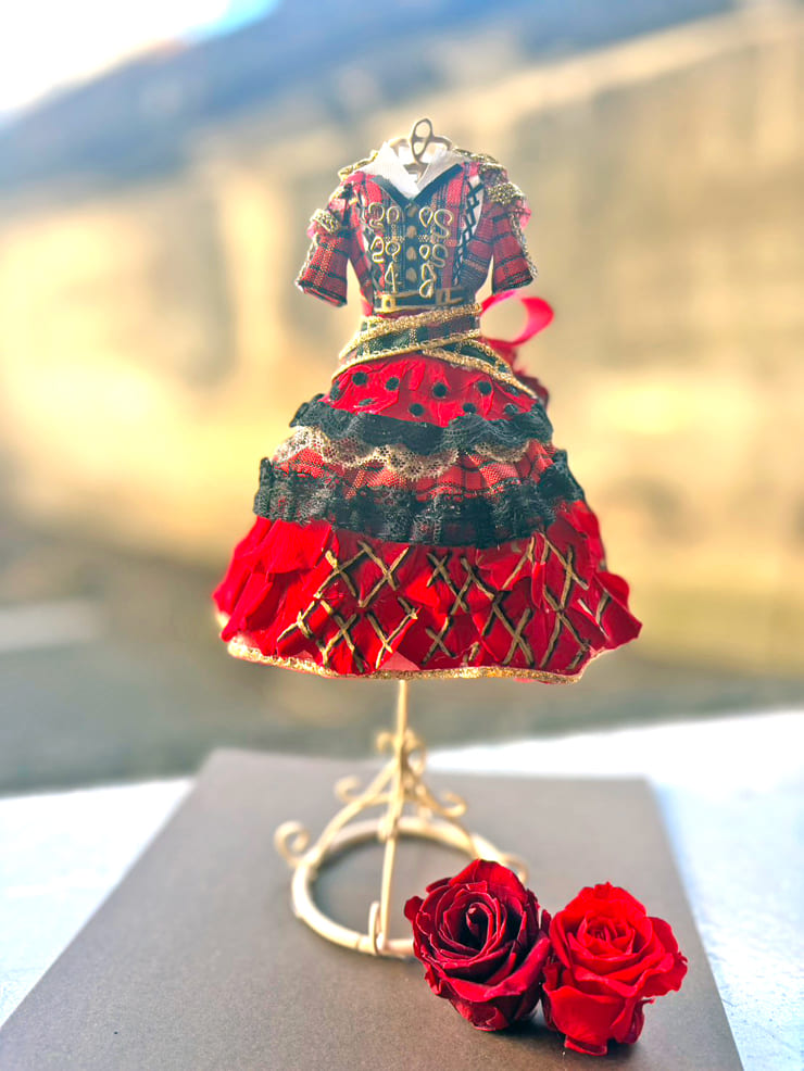 | Comment | 赤のチェックミニドレス再現。 凝ったデザイン、複雑な生地の切り替え部分、チェック柄など細かく再現。 胸元の装飾も忠実に。 下部は2輪の赤バラで装飾。 |