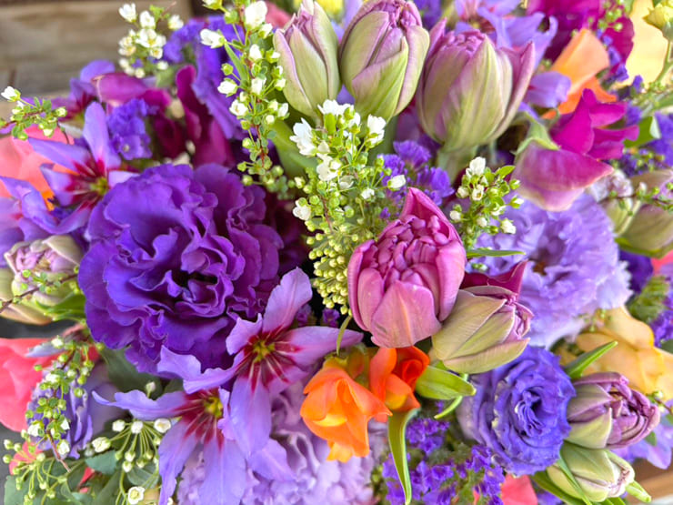 チューリップ、トルコキキョウ、スイートピー(4種)、リューココリーネ、スターチス、雪柳、コデマリ |