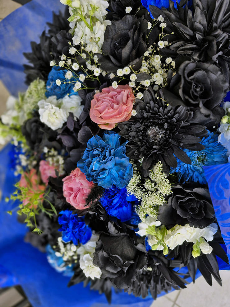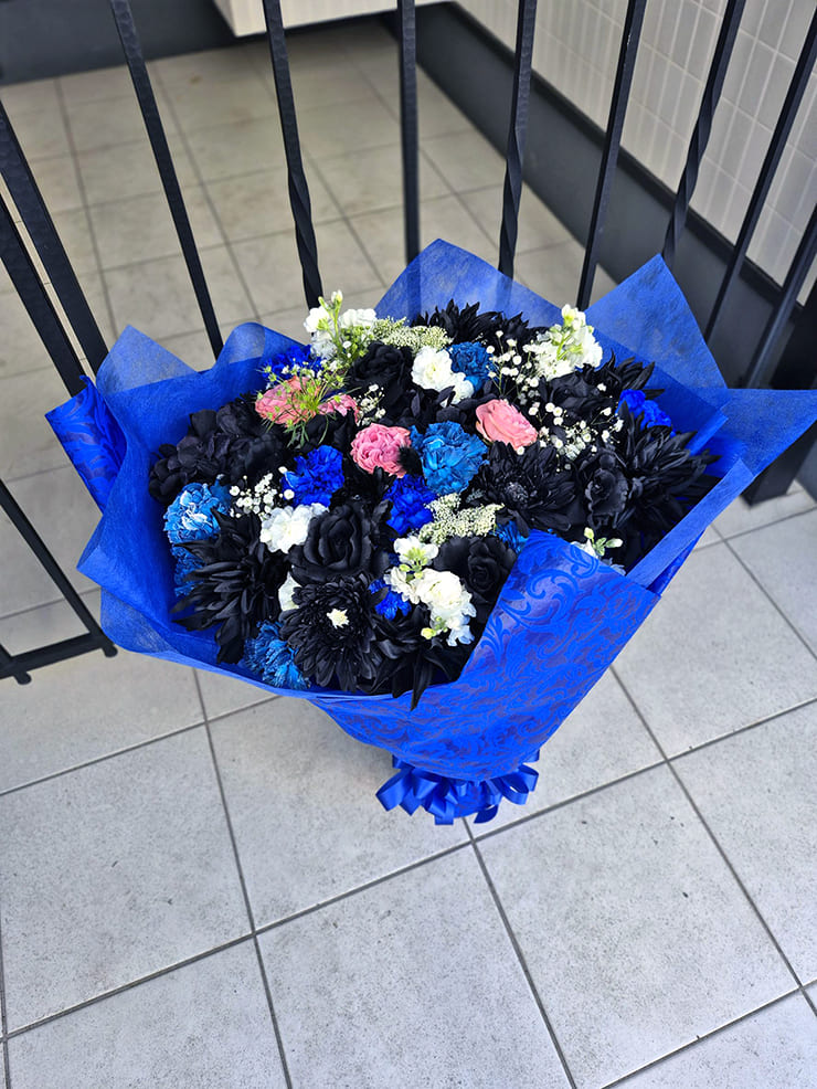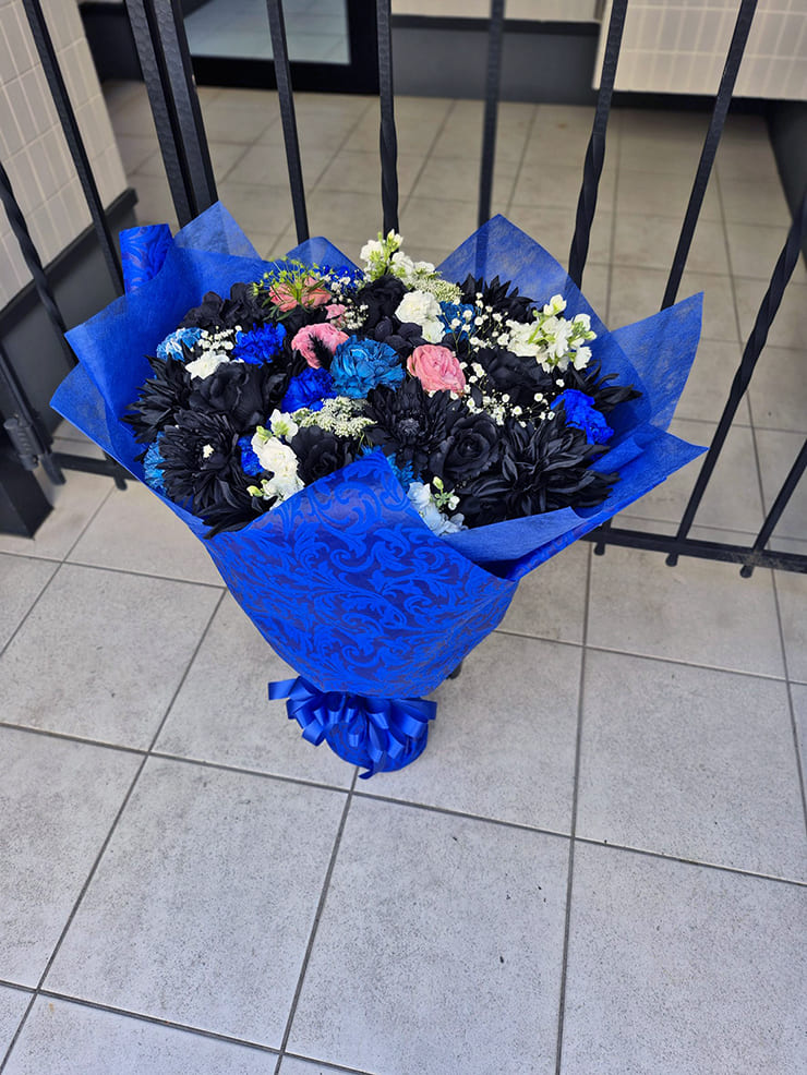 | Comment | 衣装をイメージ。 黒、白、青、ピンクを使い、お作りしました。 黒は造花を使ってお作りしました。 |