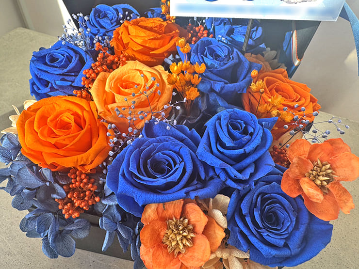 | Comment | プリザーブドフラワーでBOXアレンジを制作。 箱を開けた状態で上蓋を固定しお花(バラ)を多めに入れにイメージの青とオレンジで仕上げ完成。 |