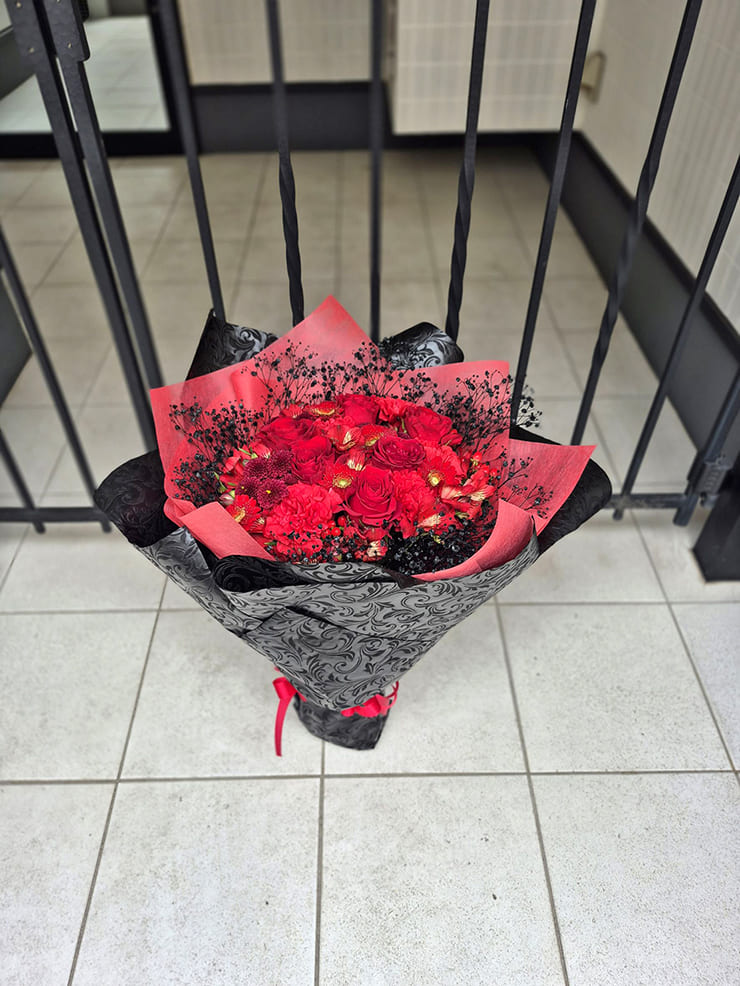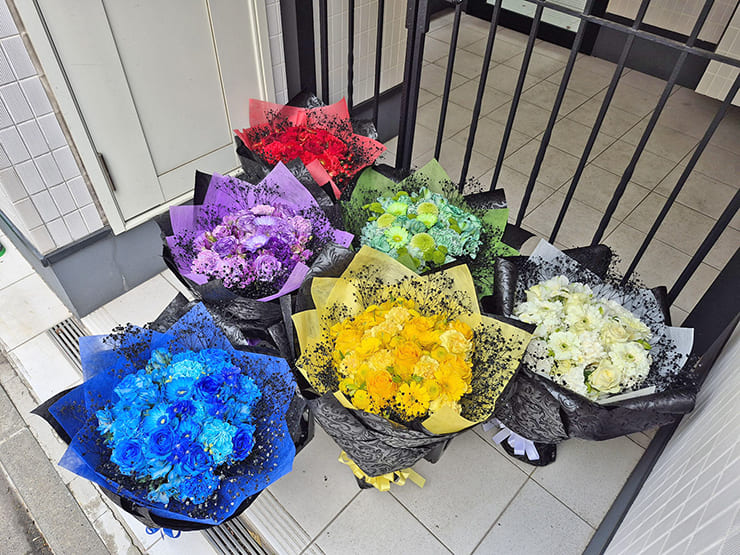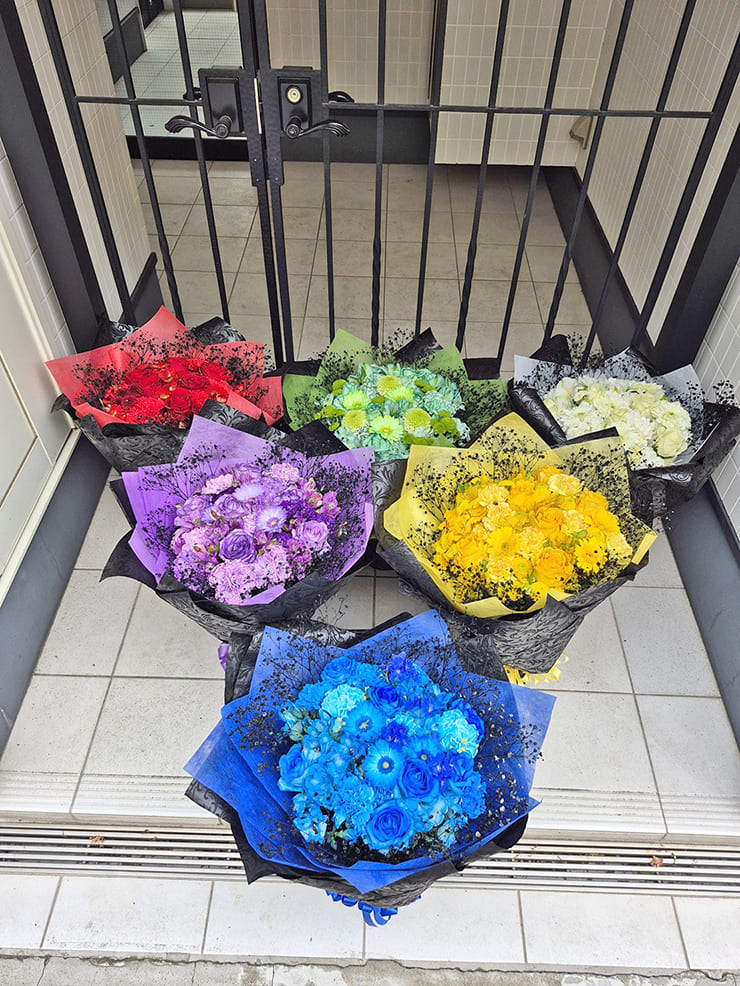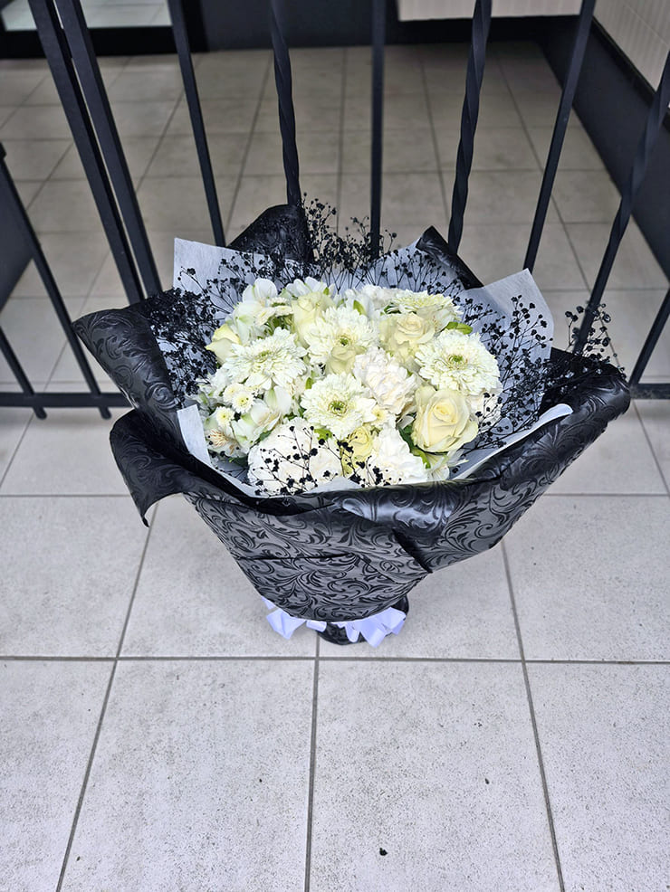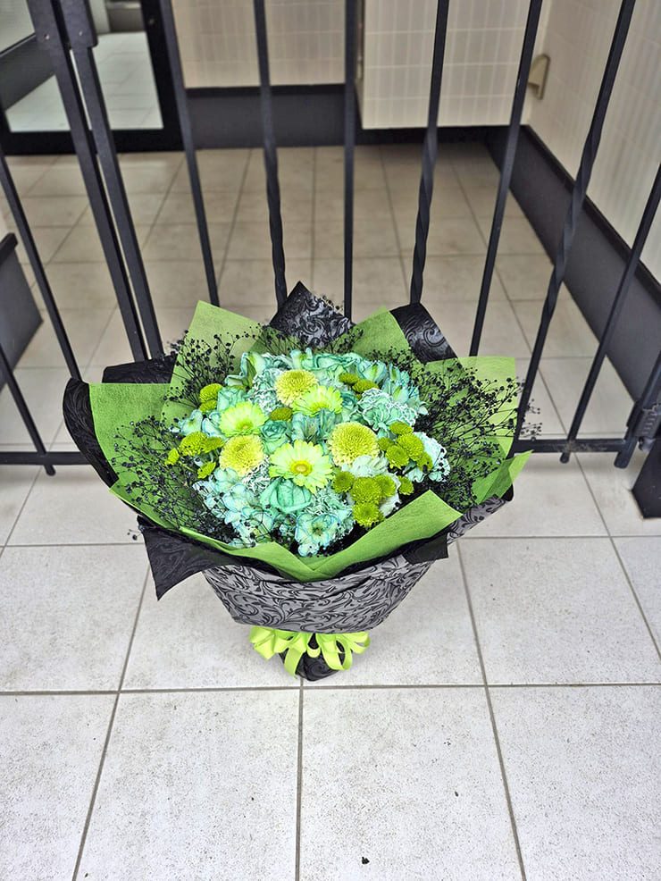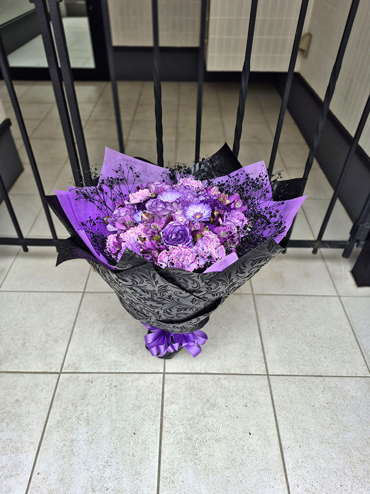 | Comment | メンバーカラーの花の周りを黒いカスミソウで囲み、黒い不織布で装飾。 落ち着いたイメージでお作りしました。 |
