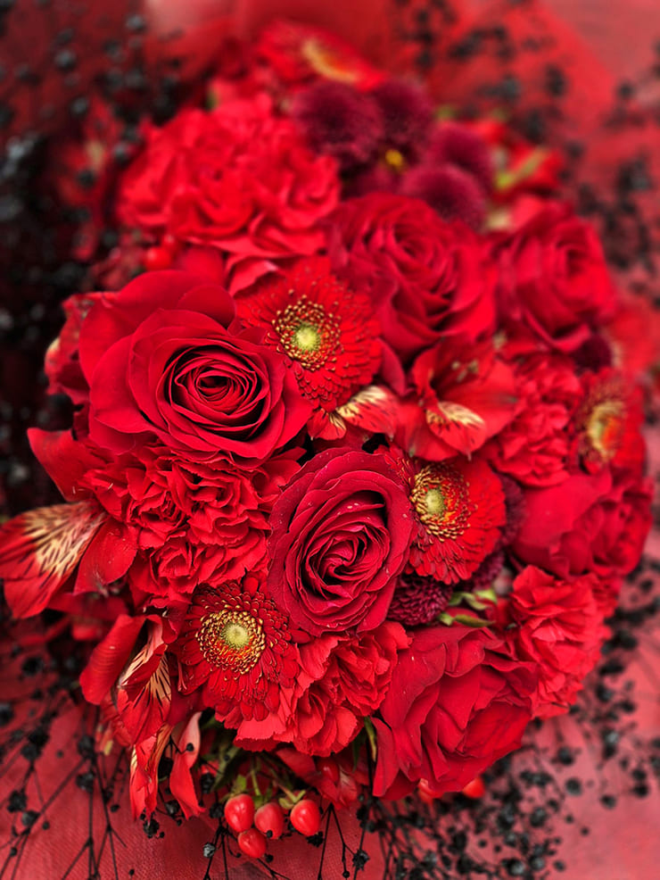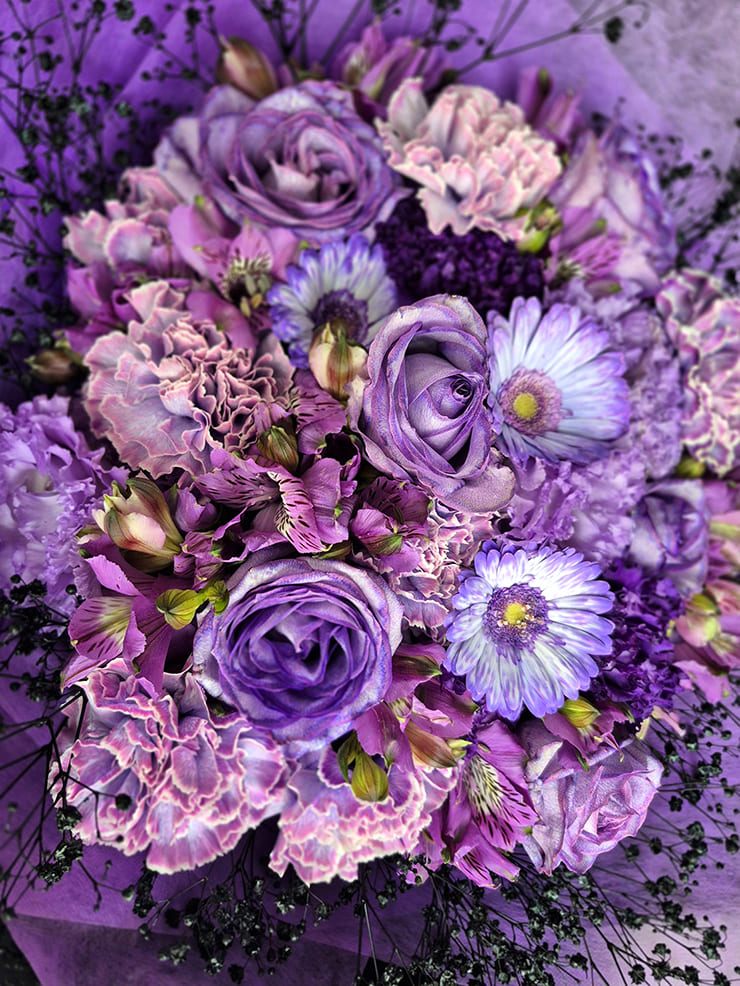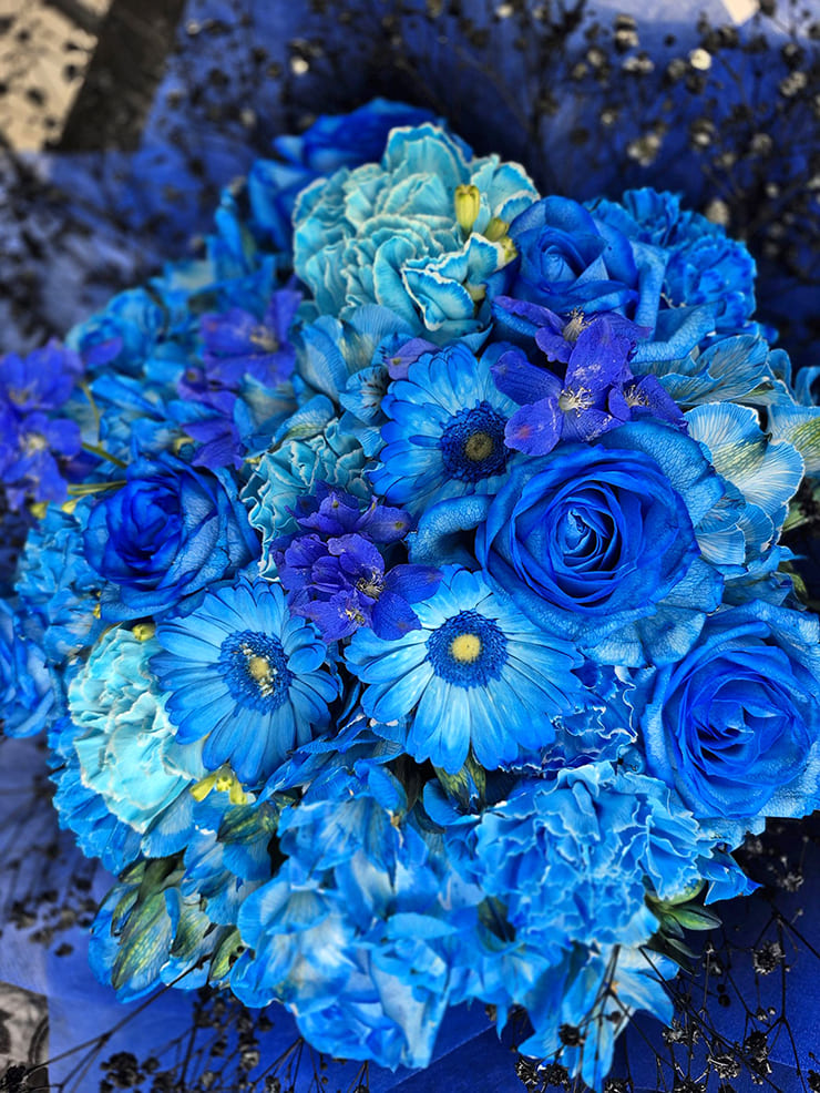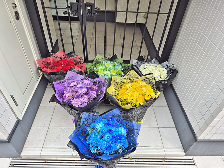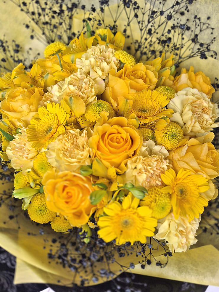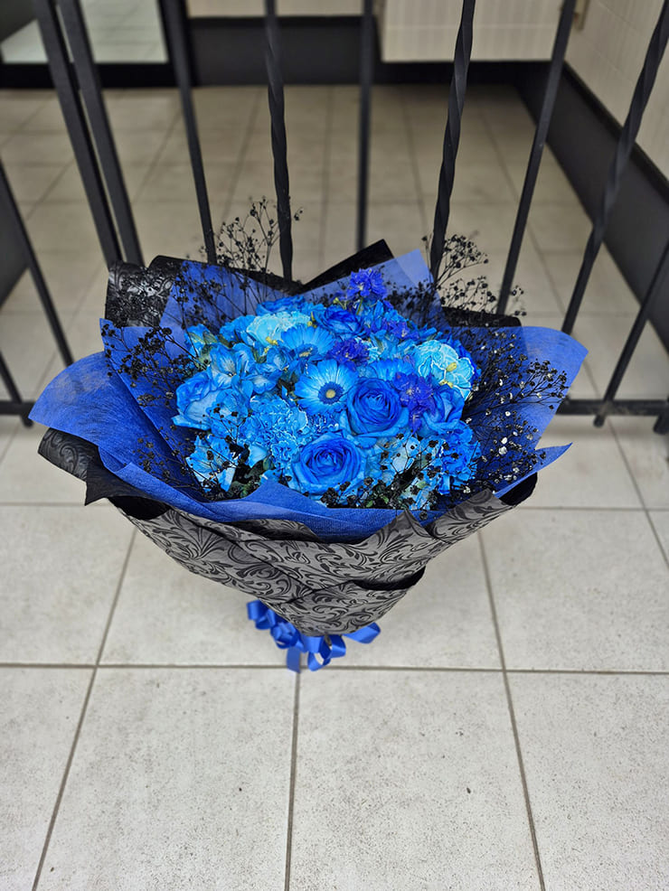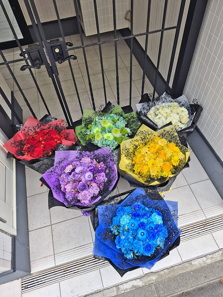 | Comment | メンバーカラーの花の周りを黒いカスミソウで囲み、黒い不織布で装飾。 落ち着いたイメージでお作りしました。 |
