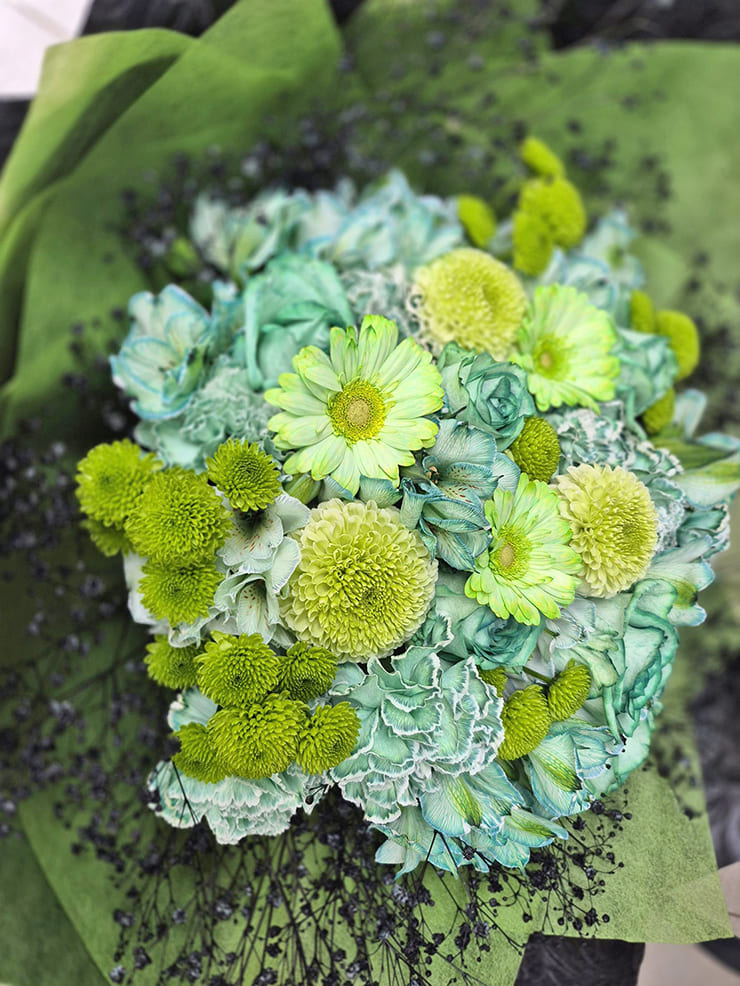 【赤】バラ、ガーベラ、アルストロメリア、カーネーション、スプレーマム、ヒペリカム、染カスミソウ 【黄】バラ、ガーベラ、アルストロメリア、カーネーション、スプレーマム、染カスミソウ 【白】バラ、ガーベラ、アルストロメリア、カーネーション、スプレーマム、トルコキキョウ、染カスミソウ 【緑】スプレーマム、ピンポンマム、染バラ、染カーネーション、染ガーベラ、染カスミソウ 【紫】アルストロメリア、染バラ、トルコキキョウ(2種)、染カーネーション、染ガーベラ、染カスミソウ 【青】デルフィニウム、染バラ、染カーネーション(2種)、染アルストロメリア、染ガーベラ、染カスミソウ |
