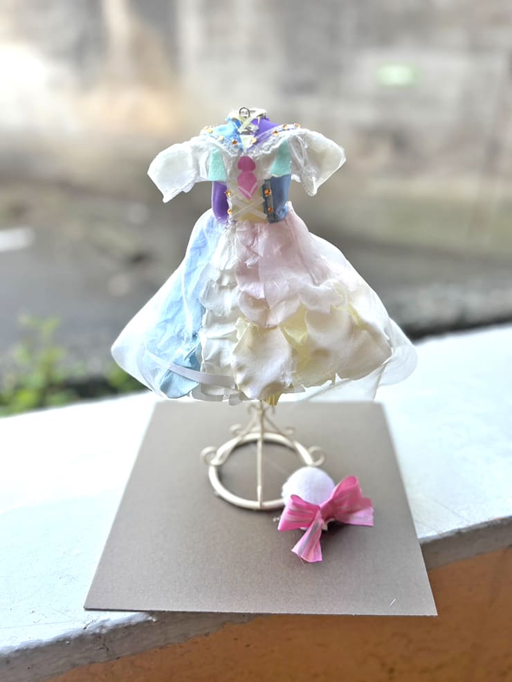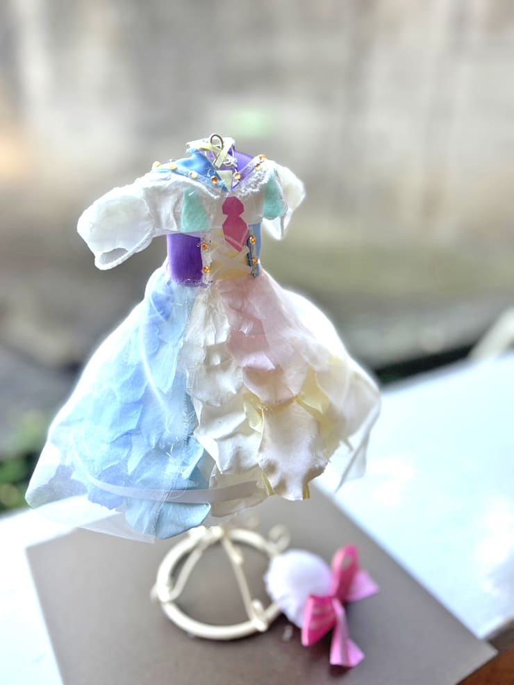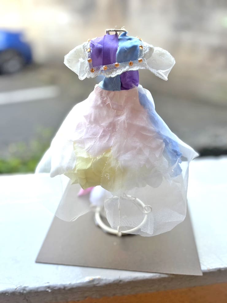 | Comment | パステルカラー、白ピンク水色。 スカート部分のボリューム感、ふんわり袖のシルエット、ピンクのネクタイ、こだわりの袖とスカートのレース素材まで忠実に再現。 ベレー帽ピンクリボンを下部に装飾。 |